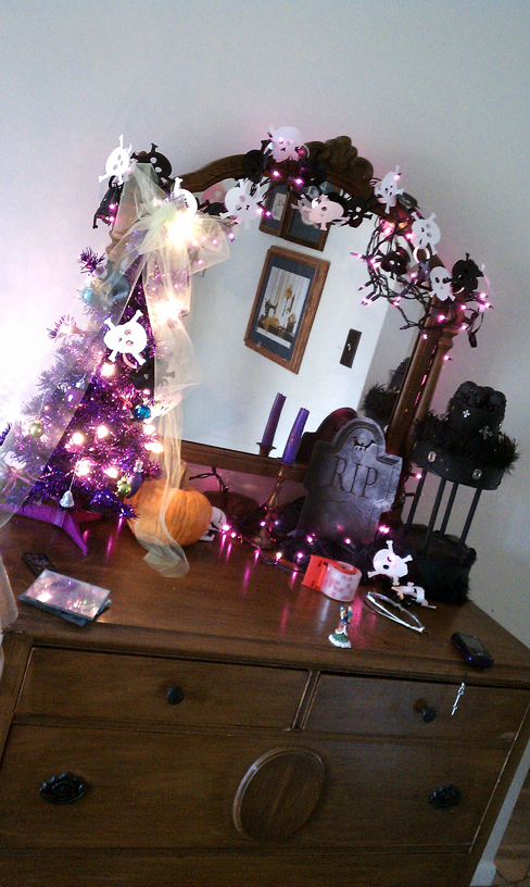We started setting up the night before, putting up some spookier decorations to go with the festive Christmas decorations already up at Grimmy's house. The first step was rearranging some furniture, and setting up some tables the cat lounge